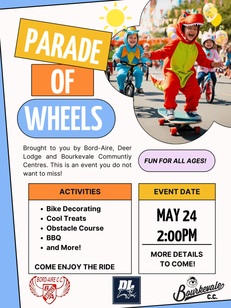 Bord-Aire, Deer Lodge, and Bourkevale Community Centres are teaming up for a brand-new neighbourhood celebration: the Parade of Wheels. Grab your bike, scooter, stroller, skateboard—or anything else that rolls—and join us on Friday, May 24 at 2:00 p.m.